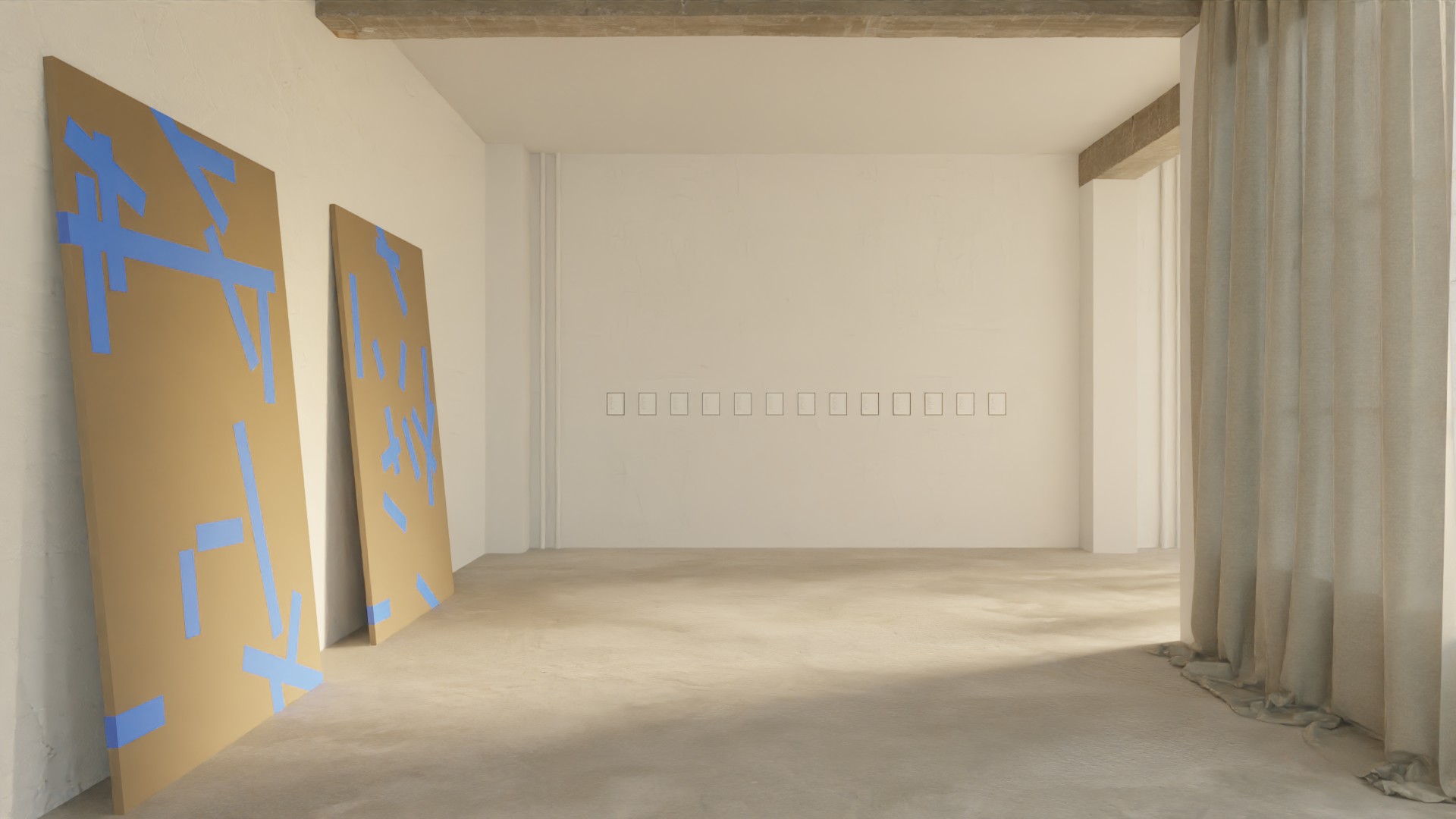 The first body of works consists of damaged sheets of MDF, whose scratches has been covered up with blue tape.